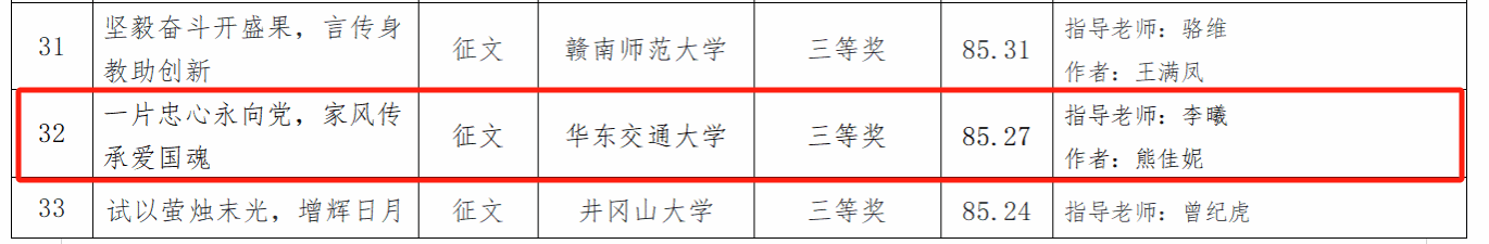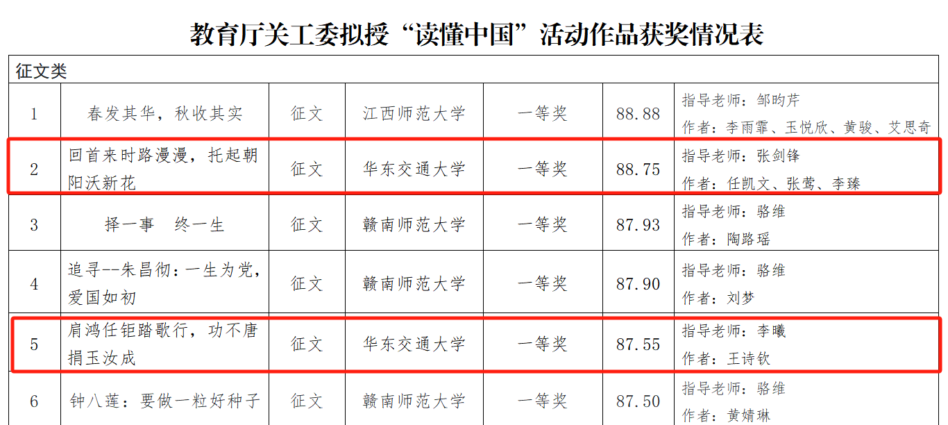 近日,江西省教育厅关工委公布拟授“读懂中国”活动作品获奖情况,伟德bevictor中文版官网研究生在征文类活动中共4项作品获奖,其中一等奖2项,二等奖1项,三等奖1项,具体获奖名单如下: