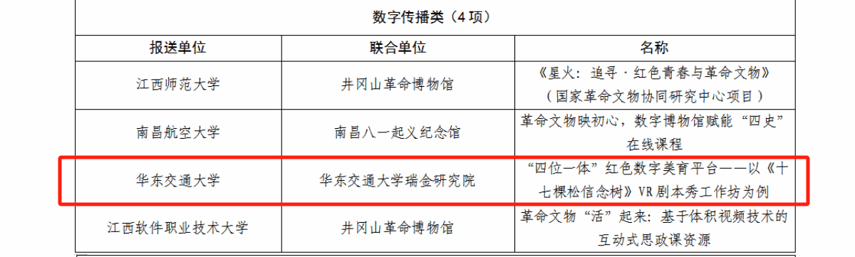 为深入贯彻落实习近平新时代中国特色社会主义思想,贯彻落实习近平总书记关于革命文物工作和“大思政课”建设重要指示批示精神,推动革命文物资源与大中小学思政教育一体化建设融合发展,省文化和旅游厅、省教育厅联合开展了2024年度以革命文物为主题的“大思政课”优质资源建设推广工作。经相关单位推荐以及专家评审,江西省教育厅公布了“江西省2024年度以革命文物为主题的‘大思政课’优质资源项目名单”,其中伟德bevictor中文版官网联合伟德bevictor中文版官网瑞金研究院报送的项目“‘四位一体’红色数字美育平台——以《十七棵松信念树》VR剧本秀工作坊为例”,在数字传播类项目中获选。